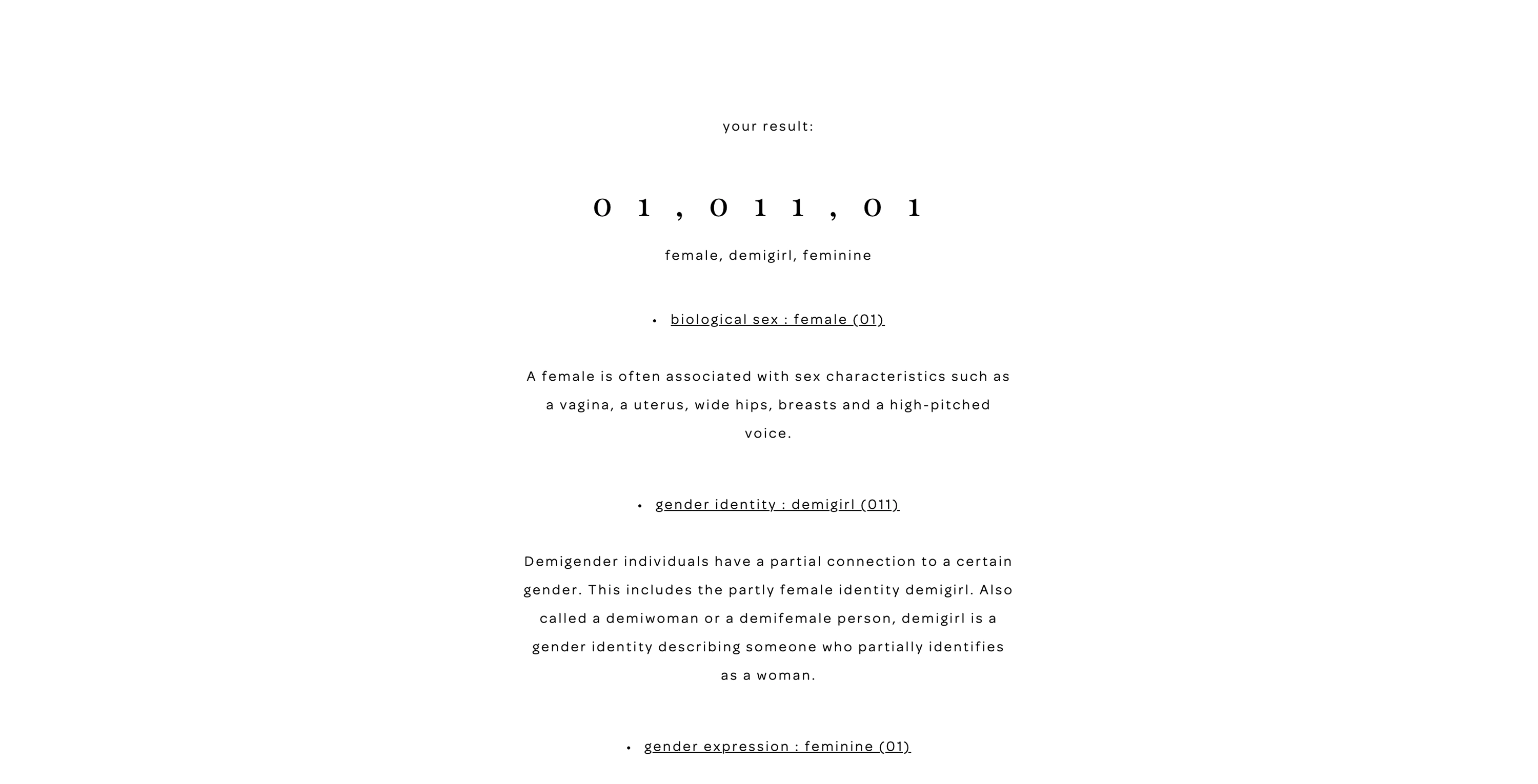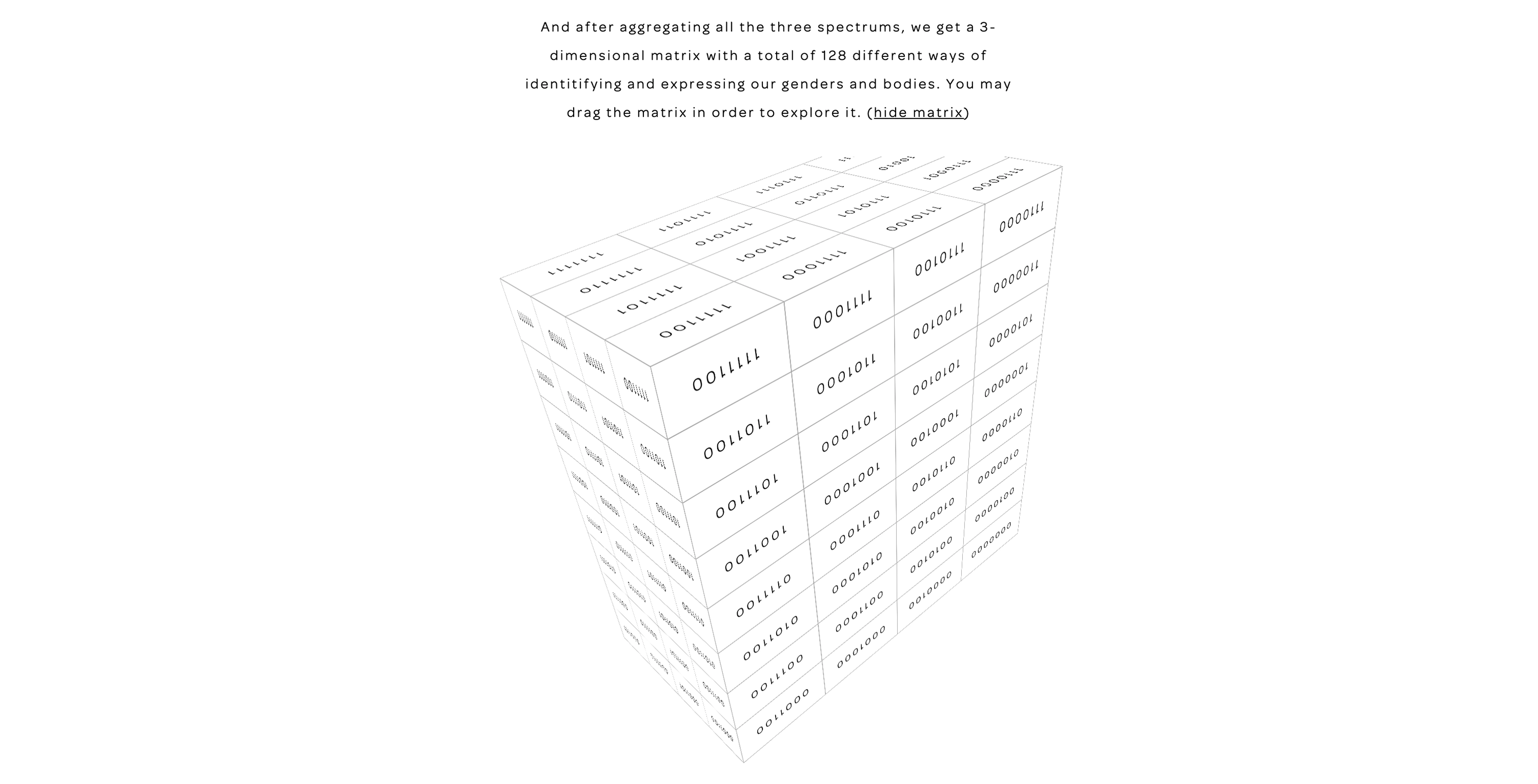 During the course of this study, I looked into 128 different kinds of non-binary genders. I gave each one a binary encoding and plotted them in a multi-dimensional space where each gender has a mathematical relationship with another. The resulting visualization suggests that gender is neither binary nor a linear spectrum—but an expansive field of endless identities and expressions.