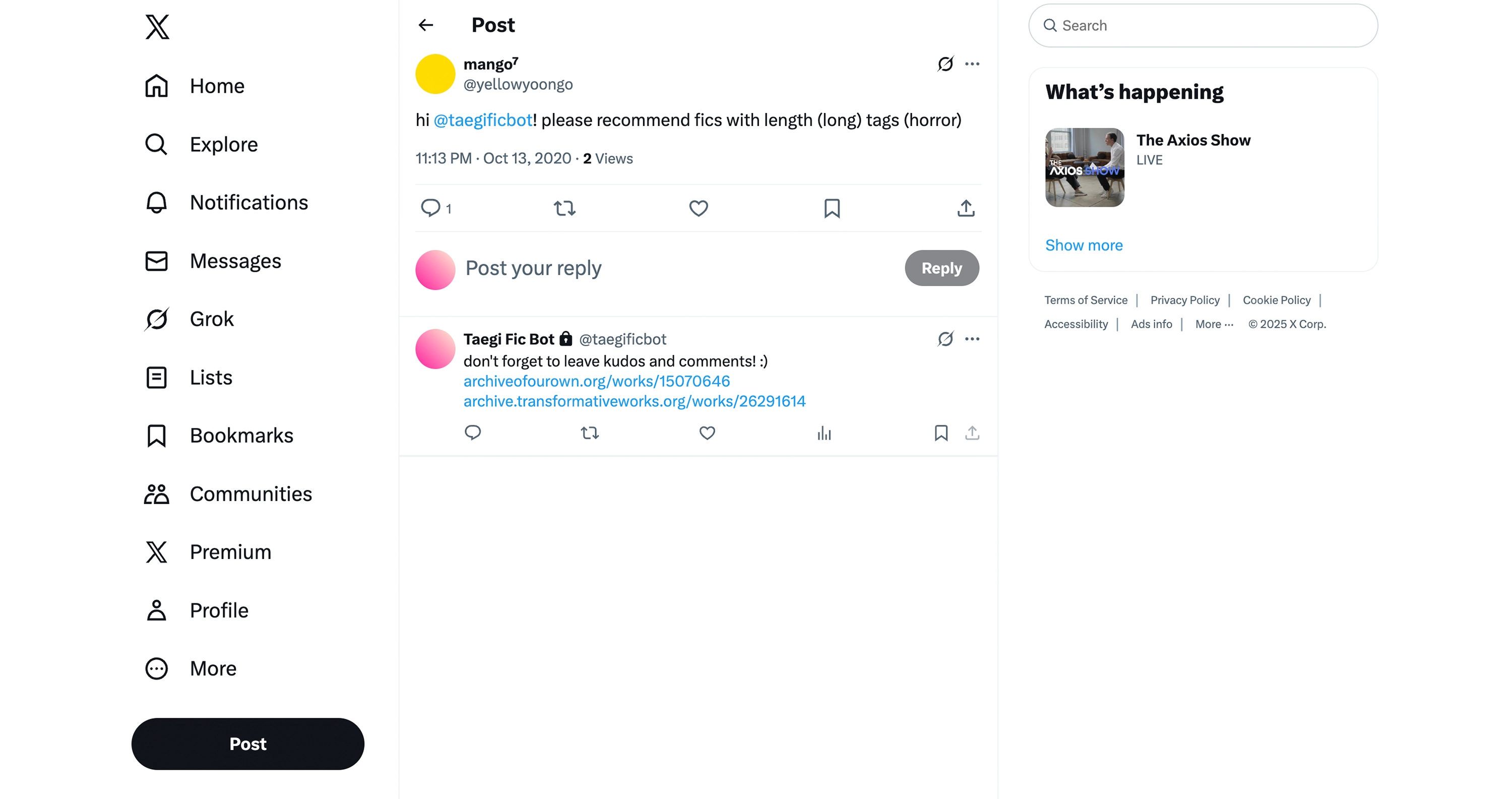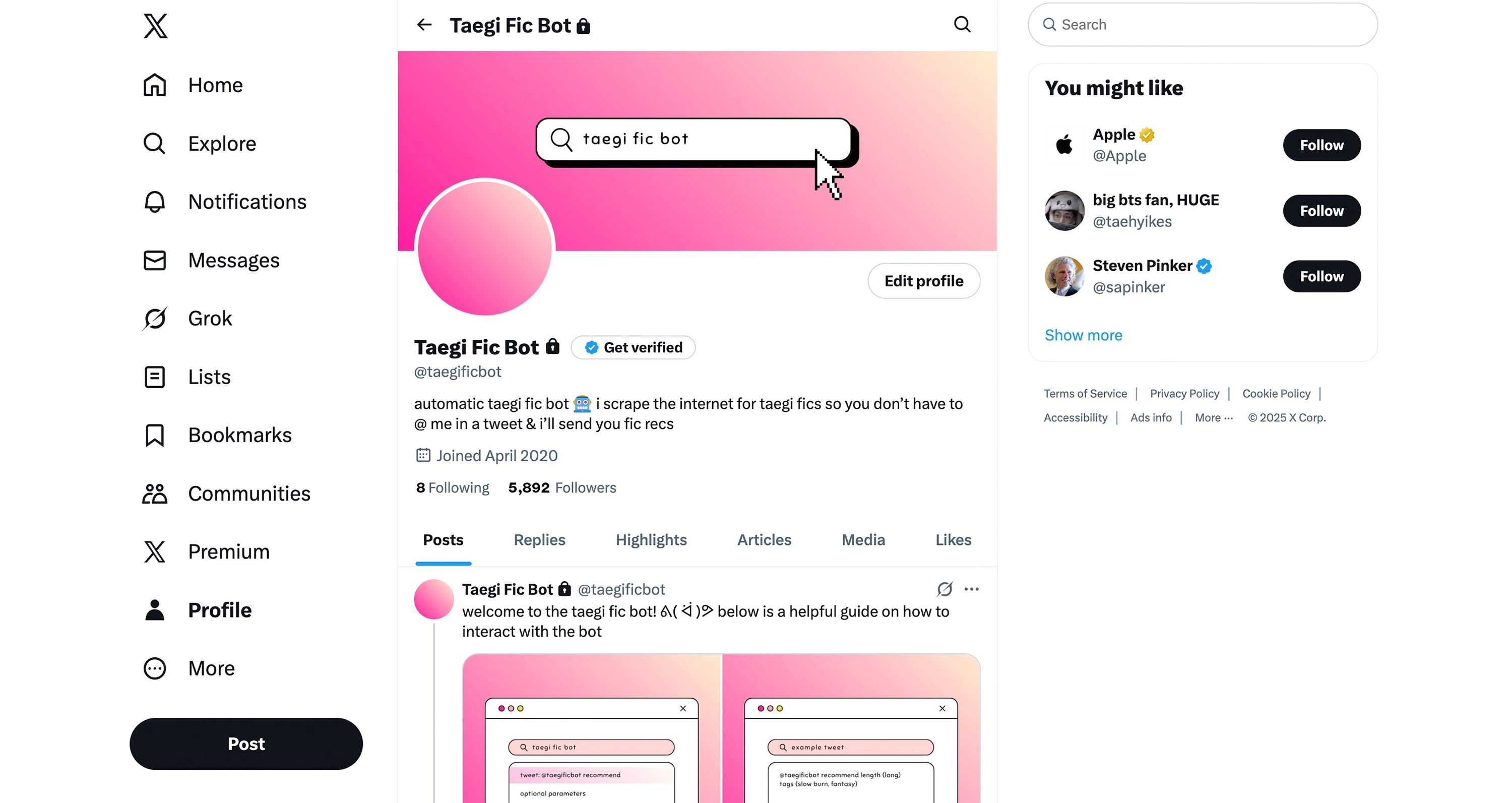 The bot’s no longer active. I eventually took it down when I stepped away from social media for personal reasons—but the code is still available on my Github. Feel free to check it out.