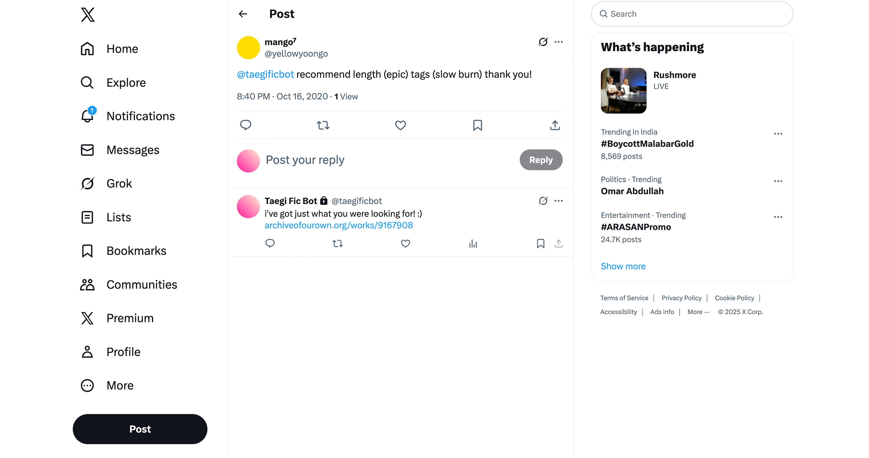 TAG MY BOT ON TWITTER & IT REPLIES WITH CUSTOM BTS FANFICTION RECS